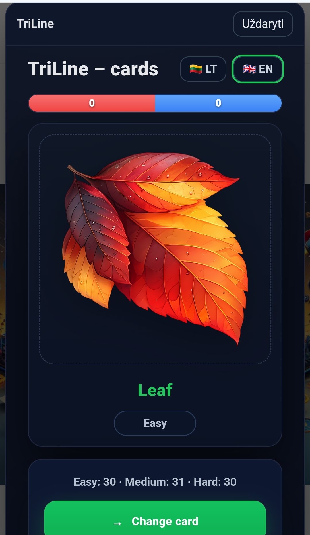 Descrizione: TriLine is a fast, team-based party game about saying a lot with almost nothing. On your team’s turn, one player becomes the Drawer and reveals a prompt. Their challenge: depict it using only three strokes, where each stroke may be straight or include one bend. No letters, numbers, words, or arrows—just clean, minimalist lines. Teammates have up to three guesses to identify the drawing. If they miss, the opposing team gets up to three “steal” guesses for a point. Still stumped? The Drawer may then silently act out the same prompt (no sounds), giving their team—and if needed, opponents—another chance to score. Prompts come in easy, medium, and hard settings across varied categories, letting groups tune the challenge on the fly. Rounds are brisk, teach-as-you-go, and highly replayable; creativity, clarity, and clever teamwork matter more than artistic skill. The first team to 5 points wins. —description from the publisher