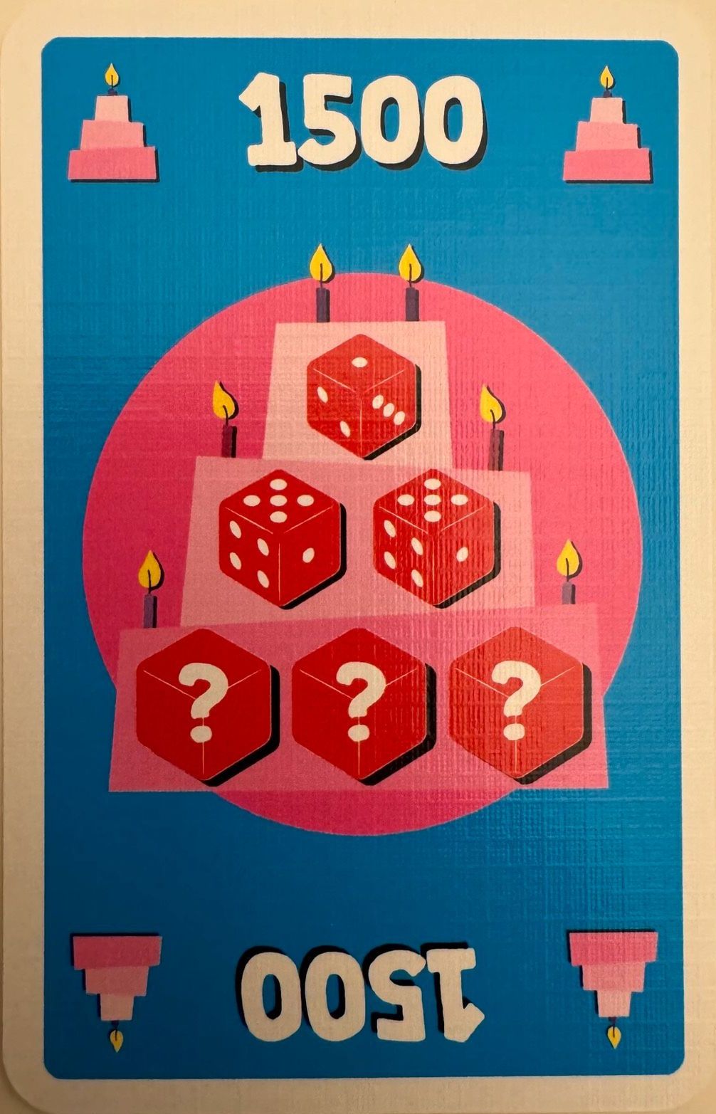 The card counts 1500 points, if you set aside 3 dice of a kind two dice showing a 5 and 1 die showing a 1.