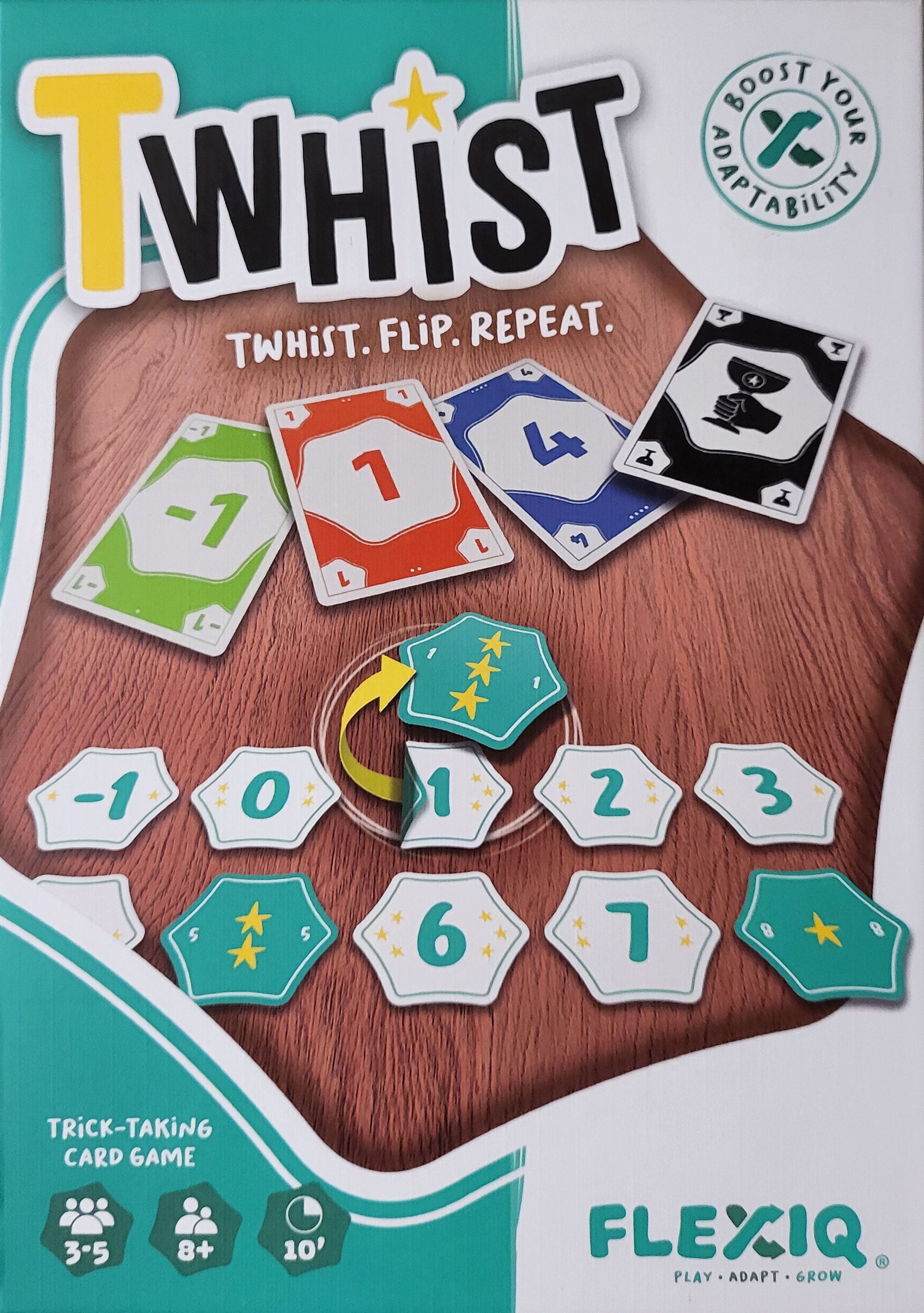 Descrizione: Twhist is the new innovative trick-taking game, full of twists, which will challenge your tactical skills and your adaptability to the max. Use your hand wisely to win tricks and collect active stars on your FLIP-cards. To win a trick, play the highest number card of the leading suit. The trick winner then selects 1 or 2 number cards and hereby determines which FLIP-cards must be flipped by them and by all their opponents. ADAPT: FLIP or FLIP BACK! BEWARE! Depending on the selected number cards, you may have to flip your active stars back to their number side. And maybe later back to the stars side, and so on! Twhist Cards Every player also has 4 Twhist-cards. Use these at the right time to outsmart your opponents! One card to win a trick, one to steal a trick, one to start the next trick and one to pass a trick. WIN: Collect the most active stars on your FLIP-cards to win the game. —description from the publisher