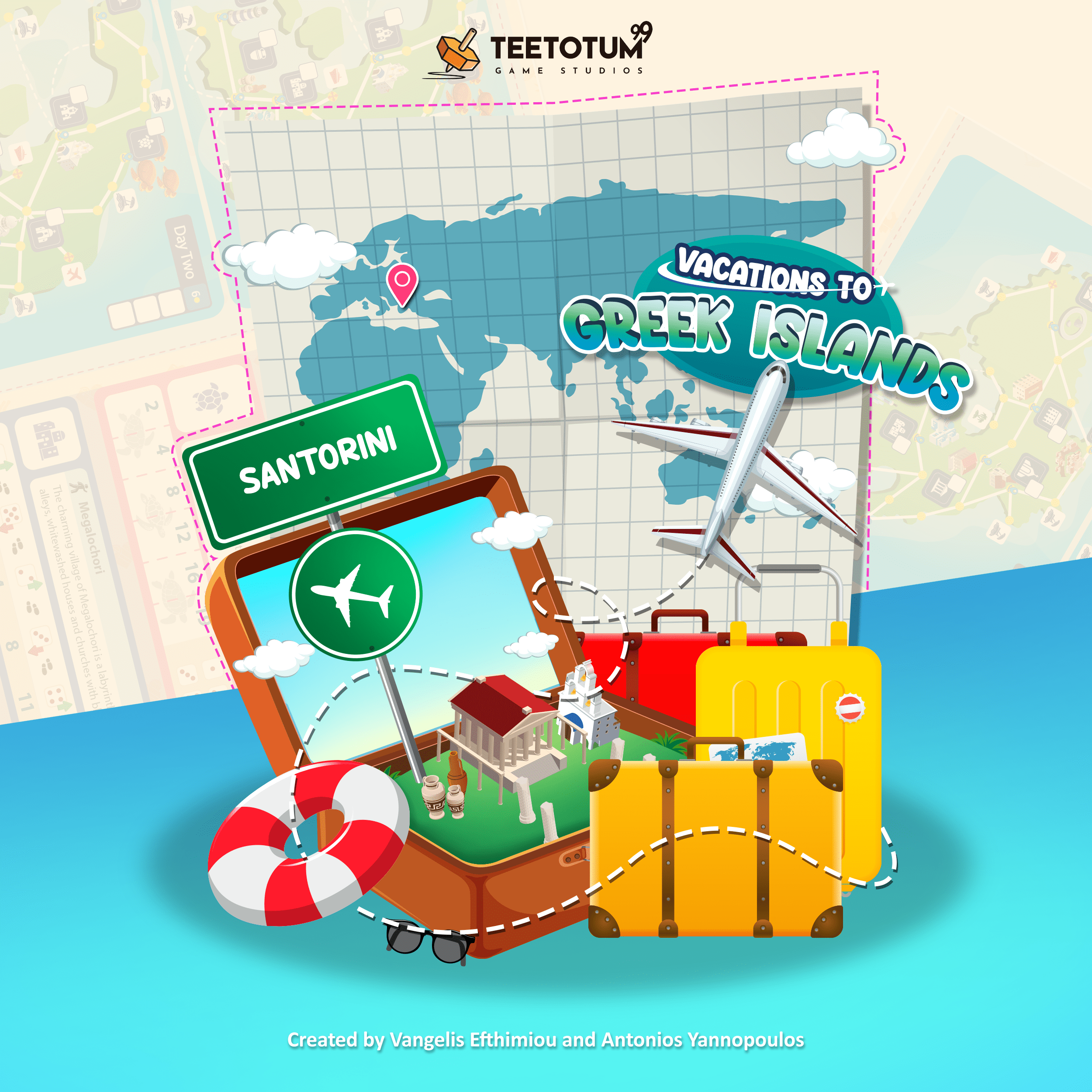 In Vacations to Greek Islands, players plan their route and visit different locations on a Greek island over the course of fourteen rounds. At each location, they can explore, hike, or admire the landscape. However, they only have three days to plan before their vacation ends, so they must choose their routes carefully to ensure they spend enough time at each location without sacrificing the opportunity to visit others. Of course, they can take pictures and rest to regain strength and plan a bigger route for the next day. Their goal is to have as much fun as possible and earn the most points by the end of the game.