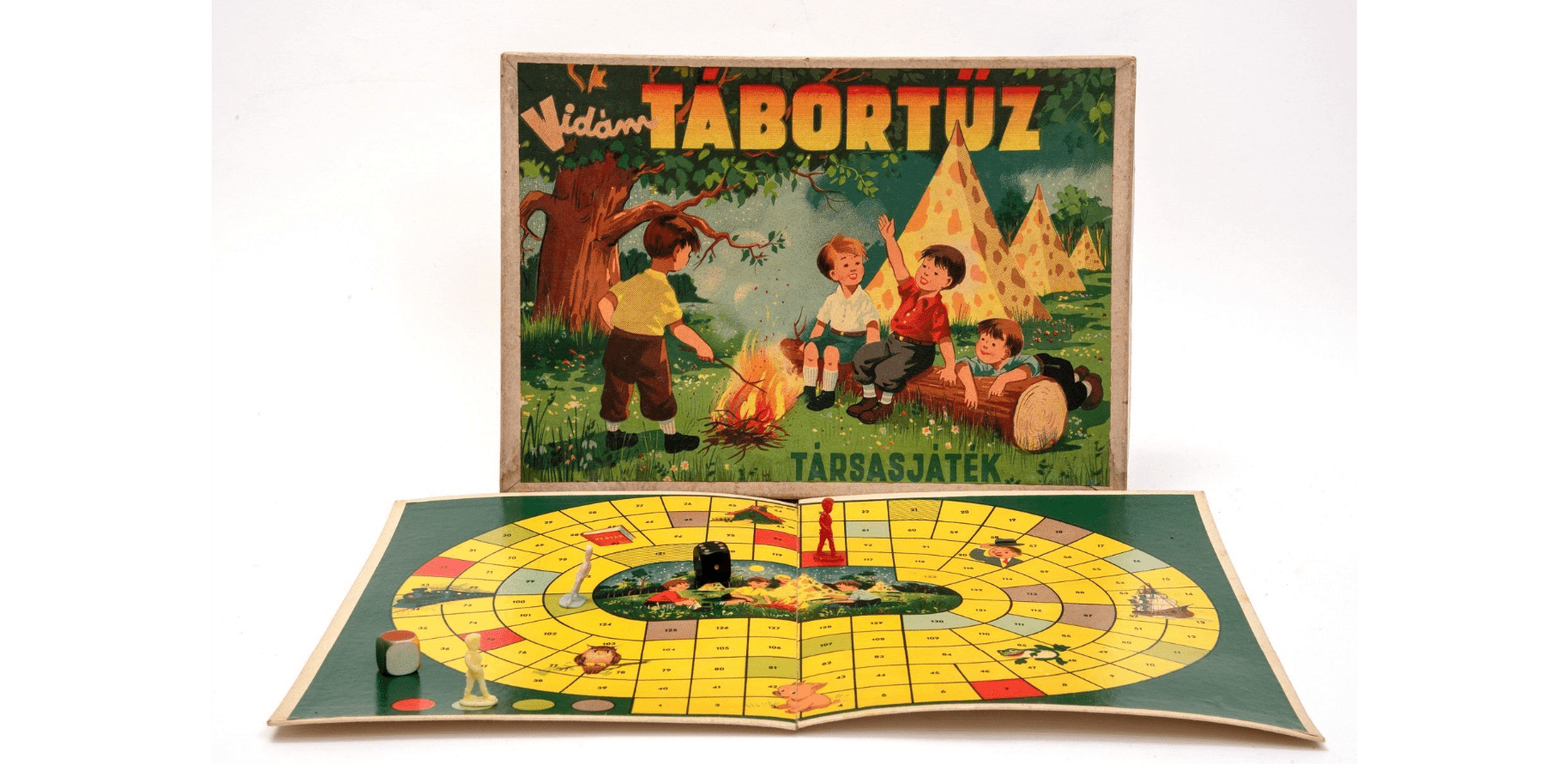 Descrizione: Lépegetős, kockadobós társas játék, tartozékok: 133 mezőből álló, kinyitható játéktábla, 3 db műanyag figura, 1 számdobó kocka és 1 színdobókocka. A doboz grafikája kisfiúkat ábrázol tábortűz körül ülve.
