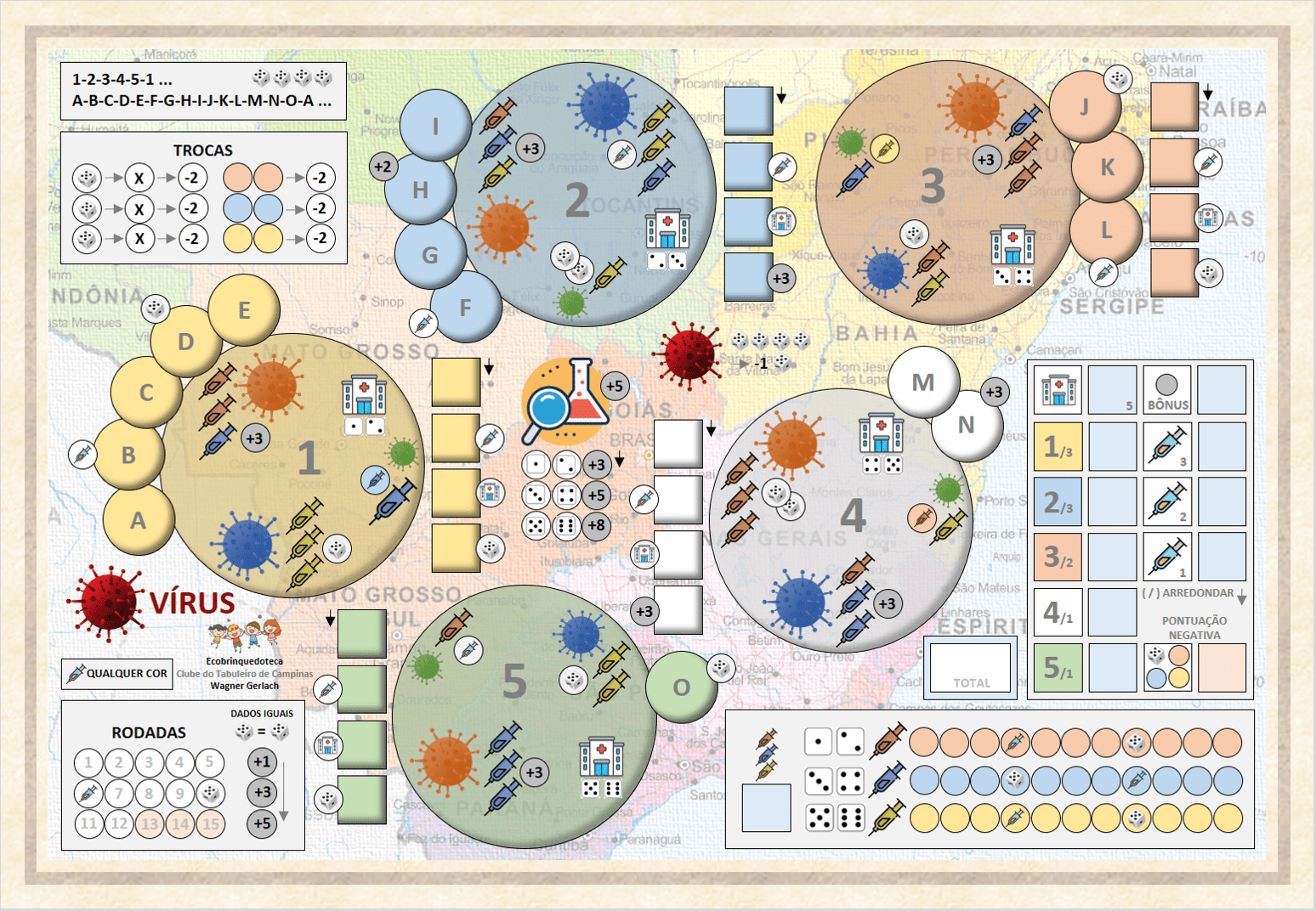 A classic Roll and Write game with combo possibilities, where the goal is to treat the population and eliminate the problems caused by the virus.