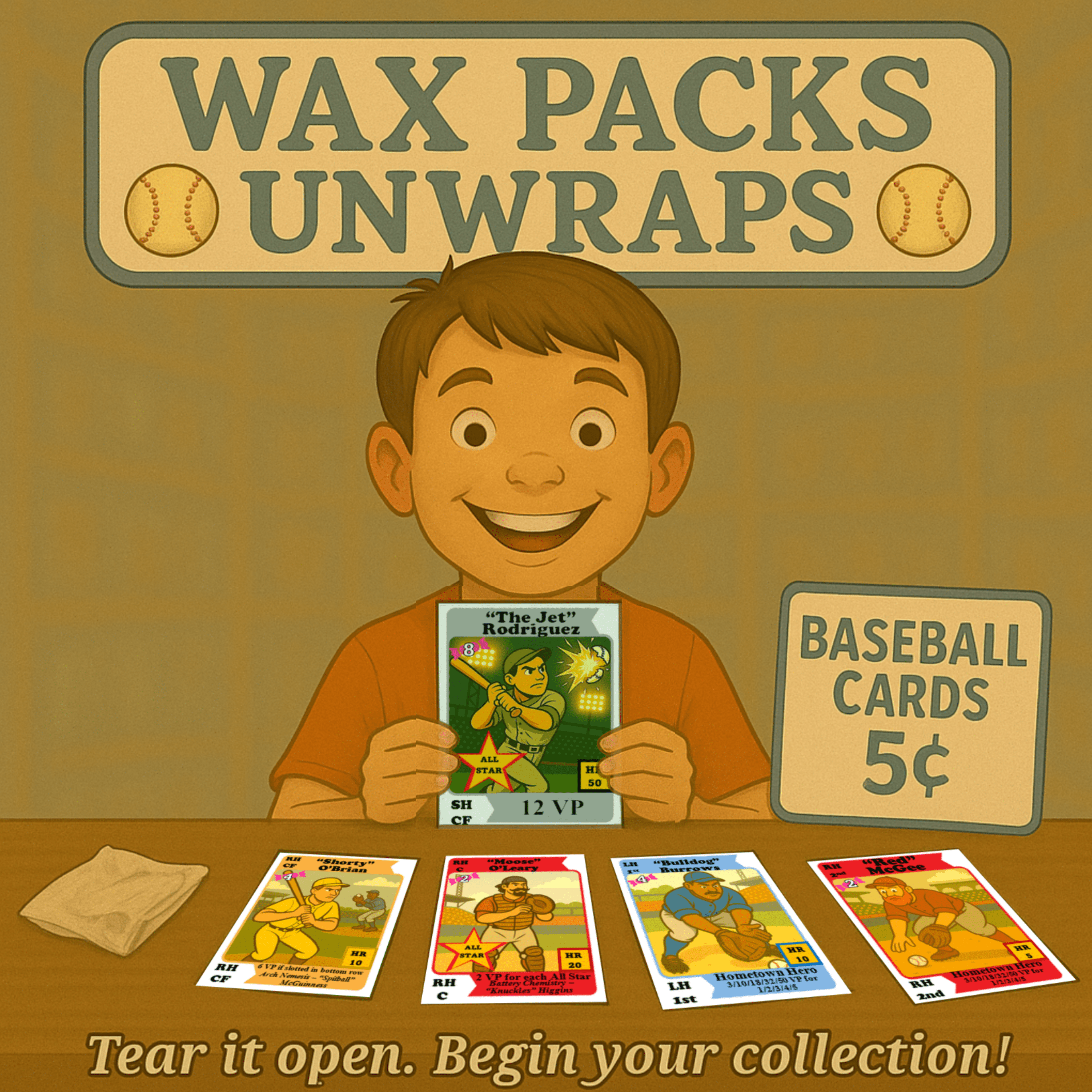 Descrizione: In Wax Packs Unwraps, players are kids in 1960's America, collecting and showing off rare and valuable baseball cards of their favorite ball players. Players will purchase Packs of cards, crack them open, and discover what treasures lie inside. They then have to decide which cards to keep, which to trade to other players, and which to sell to the market for bubblegum (the currency in the game). Ultimately the player who best fills up their 3×3 card sleeve grid and completes their personal goals will be the coolest kid in town. Also, don't forget to get your favorite player to autograph your card for double the points!