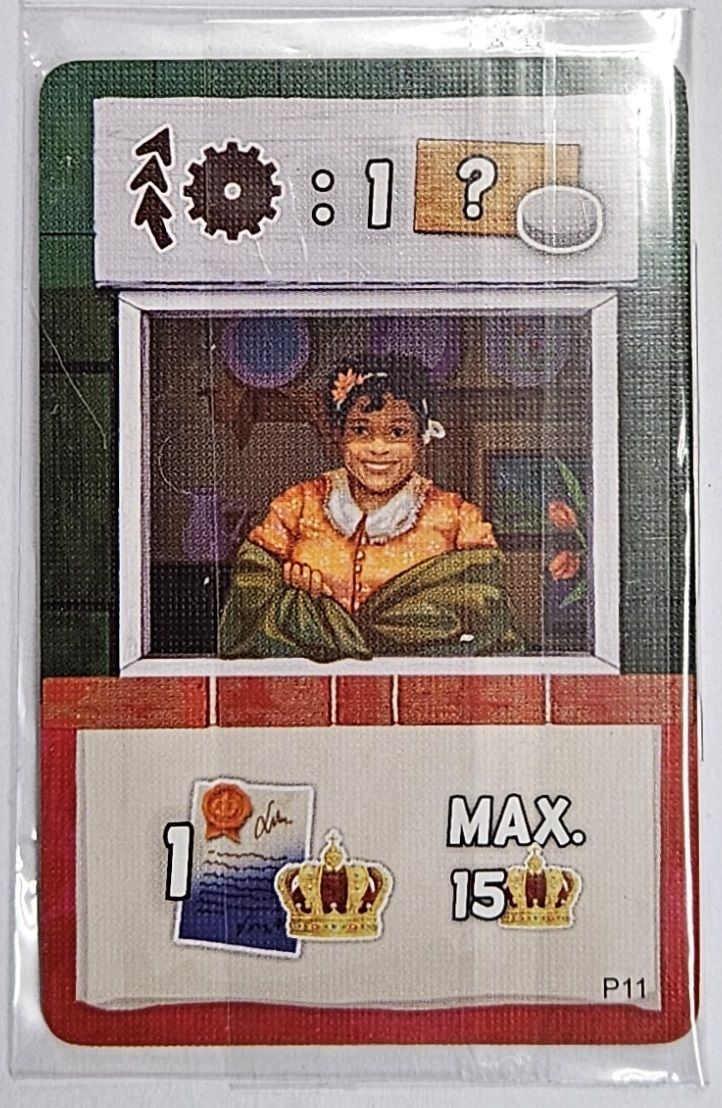 Descrizione: Three promo cards (marked P09 - P11) that were first made available for the backers of the Kickstarter-campaign of Board&Dice Accessories. They extra helper/contract cards. As helper they give you a bonus when you move the Floodgate marker up. As a contract they let you score an other contract of a specific color (with a maximum of 15 VP).