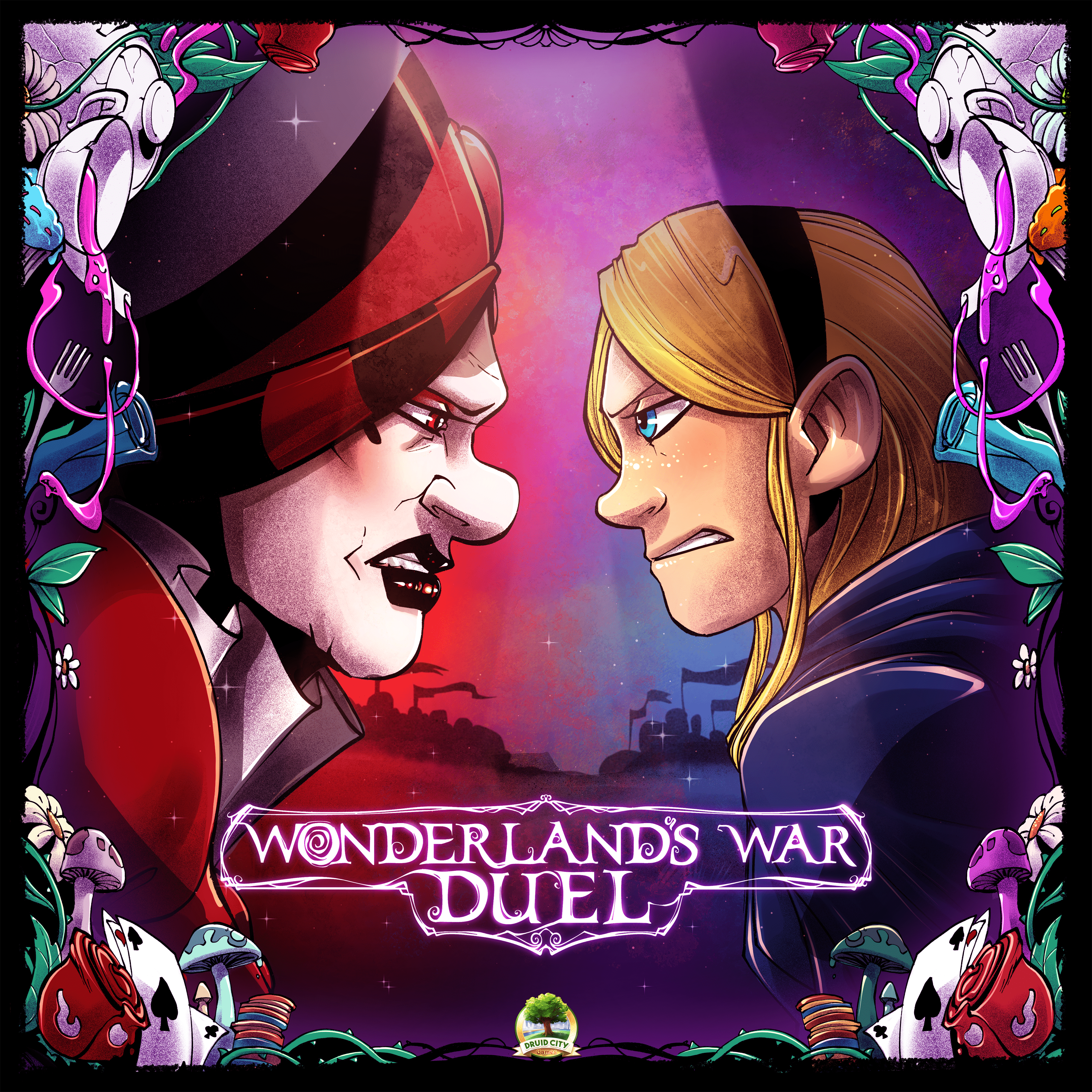 (Wonderland's War the original game we are referencing can be found here on BGG. It features bag building, area control, and card drafting. You take on one of the asymmetric characters in Wonderland and fight to be the leader after the war has concluded.)
