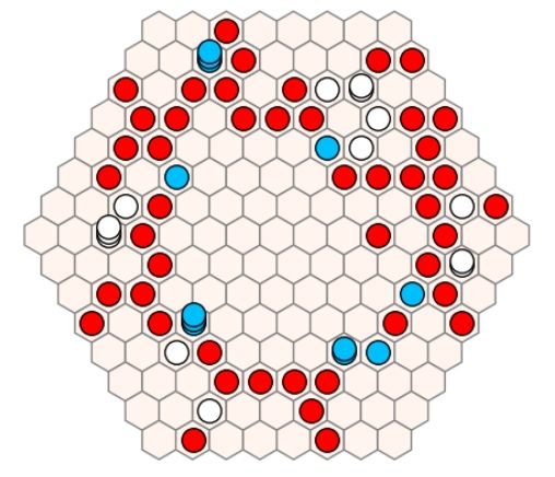 Descrizione: Players, on their turns, drop/move a stack (there's a limited amount of stackable pieces) and optionally drop two walls into empty hexes. Stacks without liberties are captured.