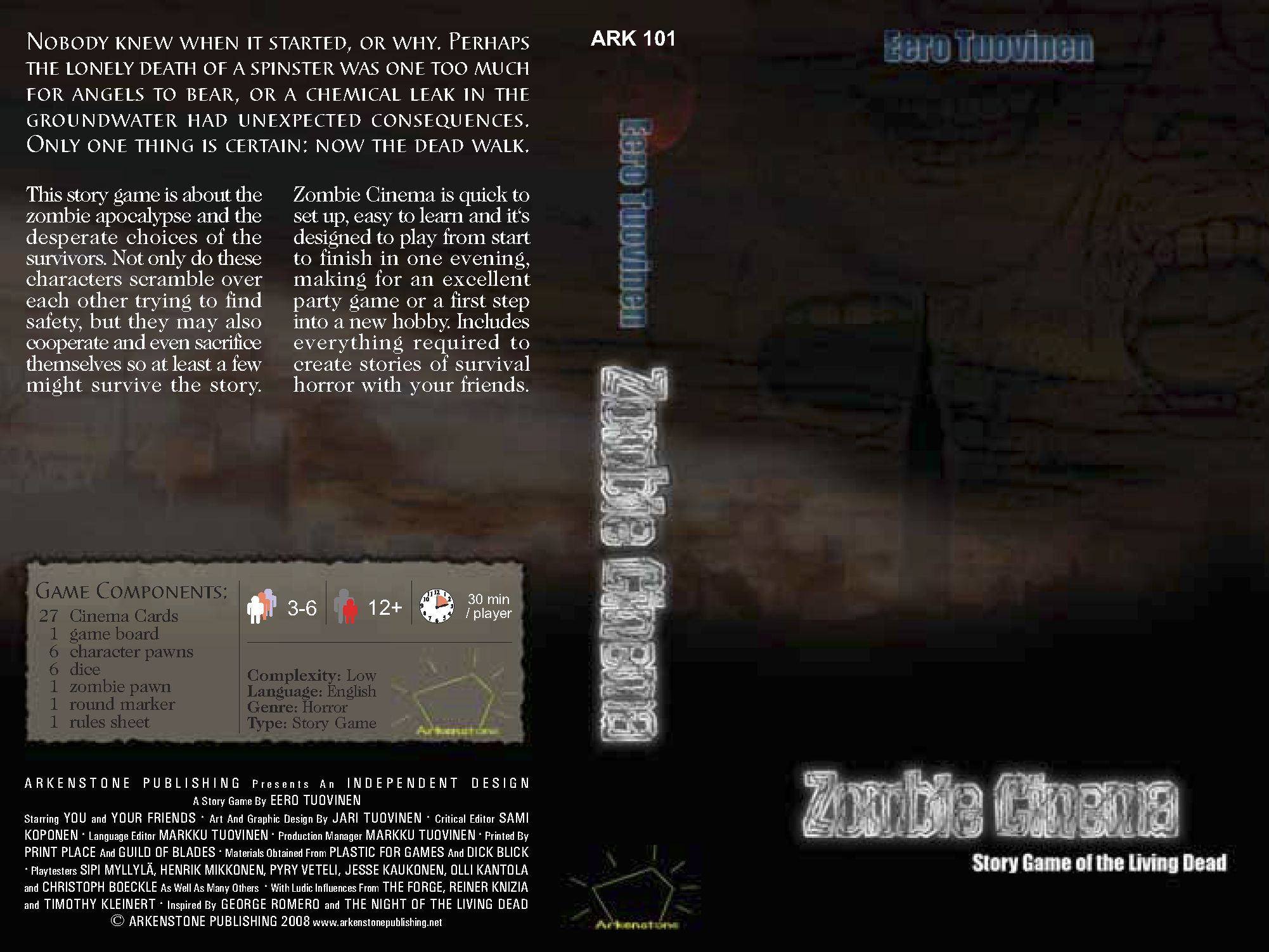 Descrizione: Zombie Cinema is a boardgame for 3-6 players, Ages 12 and up. One game takes 2-3 hours, all told. Learning the game takes ten minutes. The game is a cooperative storytelling exercise wherein the players create a story very much like a zombie movie.