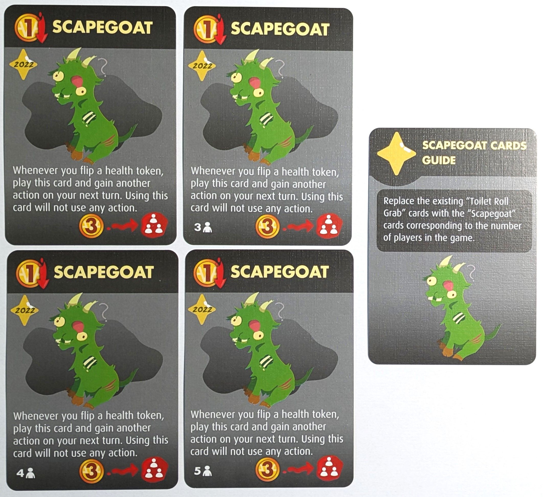 Descrizione: This pack contains 4 cards: one card for every player count (2-5). It has to be played with the original Zombielife Insurance base game. The new card is meant as a replacement for the original card called "Toilet Roll Grab" for a new and alternative effect. Scapegoat effect: "Whenever you flip a health token, play this card and gain another action on your next turn. Using this card will not use any action."